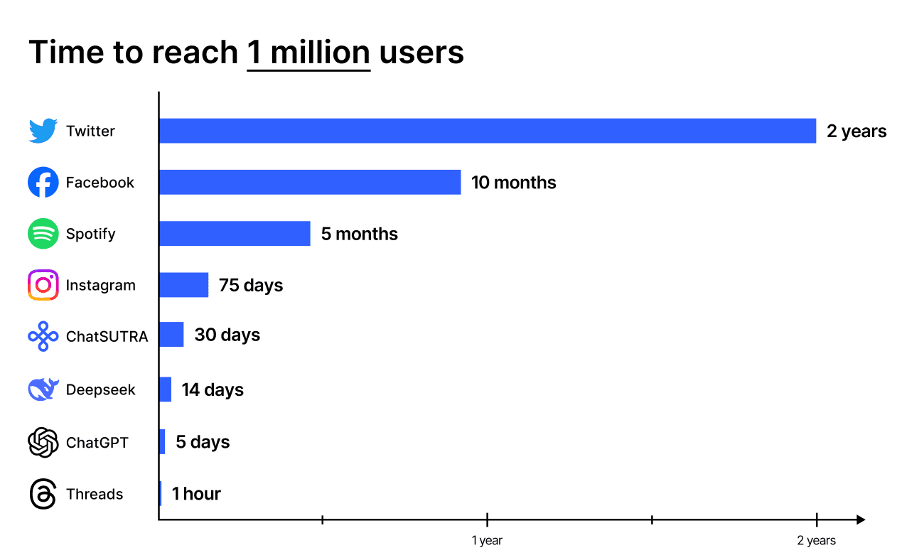 Comparing ChatSUTRA’s time to reach 1M users: Although it will be near impossible to beat the record of Threads here, ChatSUTRA shows a strong growth prospect in upcoming months by expanding its user base thru word-of mouth. We also plan to bring some new features to ChatSUTRA in upcoming months that will enable new domain specific AI use-cases.